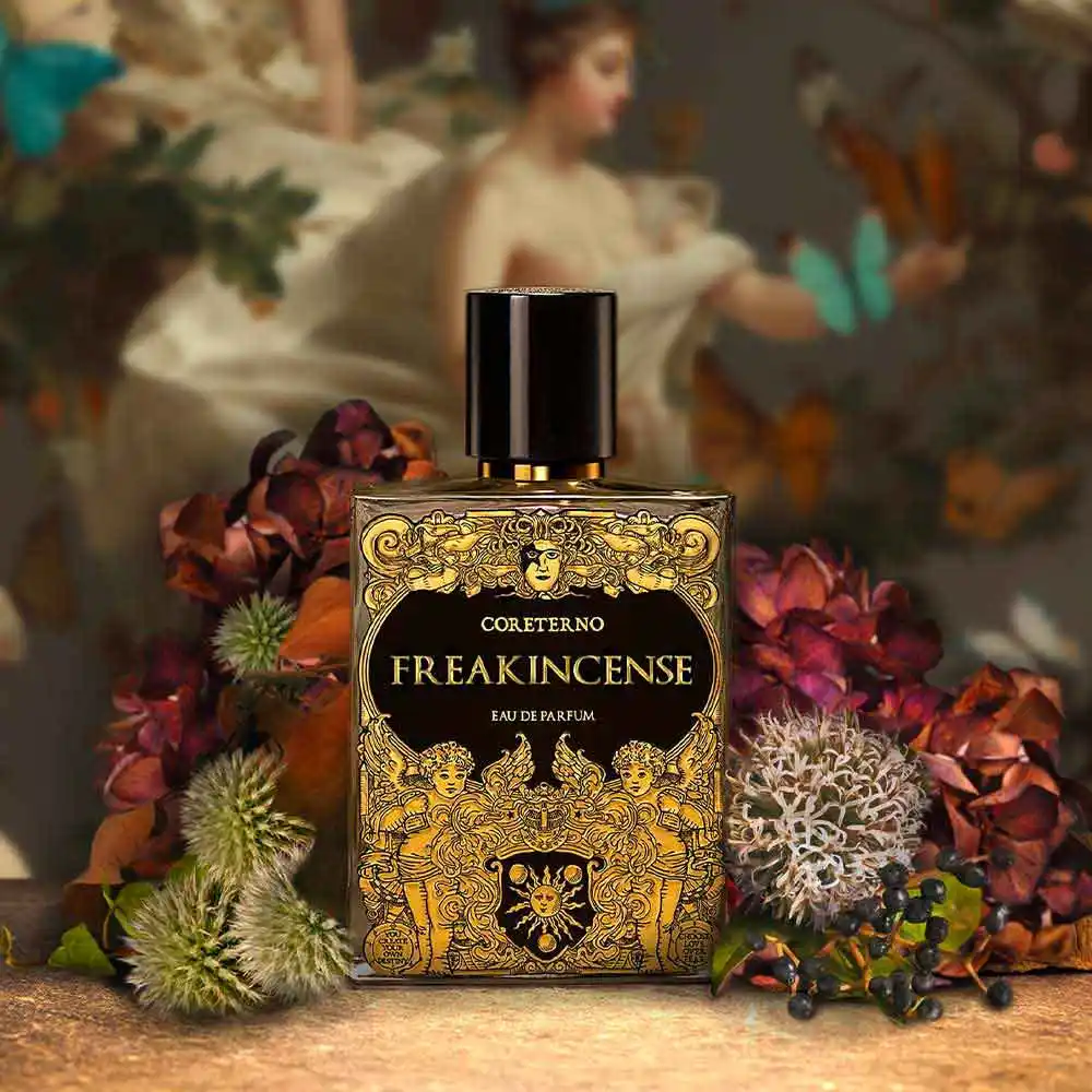 Lime, pepe rosa e la dolcezza cipriata della violetta aprono questa fragranza inebriante e anticonvenzionale, il cui cuore si avvolge di incenso ecclesiastico, misteriosamente impreziosito da elemi e cashmeran. In profondità, il vetiver umido e legnoso, il patchouli intenso e il calore sensuale del labdano. Tutto si fonde in una profonda sinfonia: un rituale che evoca mistero e sacralità, che lascia un’impronta indelebile e invita ad abbandonarsi alla bellezza delle cose intangibili. Godetevi “Freakincense” di “Coreterno”!