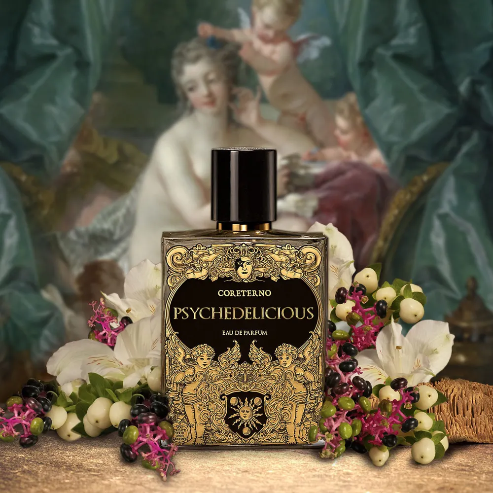 Che odore ha un sogno? Una vibrante sinfonia di bacche rosse, litchi, mango, pepe rosa e noce moscata apre questa fragranza, svelando poi un cuore delicato di rose, peonie e magnolie che rivela un’eleganza tenera e senza tempo. Infine, la base di vaniglia, vetiver e legno di sandalo aggiunge calore e raffinatezza. “Psychedeliciou” di “Coreterno” emana una scia sorprendente che ti trasporta in una foresta proibita in cui immaginazione e realtà perdono i loro confini, tra i profumi inebrianti di magiche bacche. Lasciati trasportare in un regno surreale che non potrai mai dimenticare, dove troverai la sicurezza necessaria per celebrare la tua unicità e la tua potente individualità.